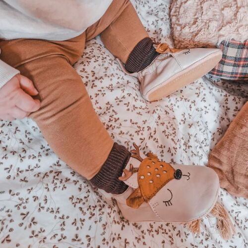La semelle intérieure des chaussons contient un insert en hévéa naturel pour le confort et l’isolation, enveloppé de cuir à tannage végétal. Elle est amovible pour un nettoyage facile. La semelle extérieure en cuir velours et dotée d’un patin en crêpe naturel. Enfin, la doublure du chausson est en cuir tanné végétal naturel, et anti-allergique, même pieds-nus !